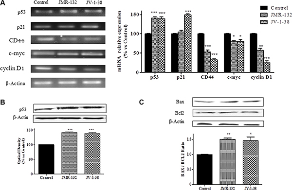 Figure 6: Effect of JMR-132 (10 μg/day) and JV-1-38 (20 μg/day) on the expression of different molecules involved in apoptosis and cell cycle in PC3 tumors. The p53 (A) and Bax and Bcl-2 (B) protein levels were determined by Western blotting using specific antibodies. Bax/Bcl2 ratio was determined and is also shown. Immunohistochemistry using a specific antibody against Caspase 3 was performed (C). The highest number of apoptotic cells was observed in treatment control samples (black cells). Original magnification X300. Data in each bar are the means ± SEM. *p < 0.05; **p < 0.01; ***p < 0.001.vs. control.