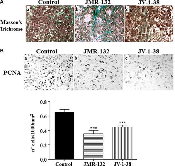 Figure 4: Effect of the GHRH antagonists JMR-132 (10 μg/day) and JV-1-38 (20 μg/day) on PC3 tumor proliferation. (A) Histological sections from tumors stained with Masson’s Trichrome. Control tumors presented scarce connective tissue between tumor cells (a); however, tumors from xenografts (b, c) presented more ground substance and areas of collagen fibers bundles. Original magnification X300. (B) Immunohistochemistry using a specific antibody against PCNA was performed. The highest number of proliferating cells was observed in control samples (black nuclei). Original magnification X300. The evaluation of the number of PCNA-immunoreactive nuclei is shown on graphical representation. Data in each bar are the means ± SEM. ***p < 0.001 vs. control.