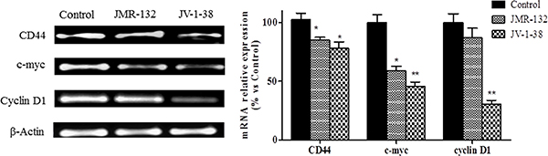 Figure 5: Effect of GHRH antagonists JMR-132 (10 μg/day) and JV-1-38 (20 μg/day) on the expression of different molecules involved in proliferation in PC3 tumors. CD44, c-myc and Cyclin D1 mRNA levels were evaluated by RT-PCR. Expression amounts were normalized with those for β-actin. Data in each bar are the means ± SEM. *p < 0.05; **p < 0.01 vs. control.