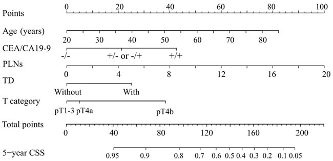 Figure 2: Nomogram predicting 5-year CSS in patients with URC after radical surgery. To obtain the nomogram-predicted probability of CSS rate, the patient value at each axis were located. A vertical line was drawn to the “Point” axis to determine how many points could be attributed for each variable value. The points for all variables were summed. Total point values were calculated and then applied to the desired probability scale on the bottom of the Figure. CA, carcinoma antigen; CEA, carcinoembryonic antigen; pT, pathological T classification; PLNs, number of positive lymph nodes; TD, tumor deposit; -, normal level; +, increased level.