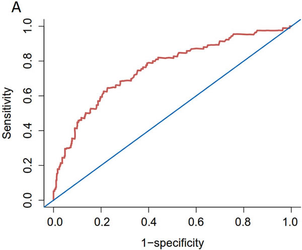 Figure 3: Internal validation of the nomogram predicting 5-year CSS in patients with URC after radical surgery. A. ROC; C-index = 0.757. B. Calibration plot; R2 = 0.996. Dotted line (45° line), the ideal line; solid lines, nomogram-predicted probabilities with 95% confidence intervals.