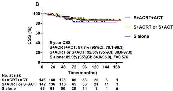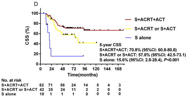 Stratification according to adjuvant treatment revealed that, in the high-risk group, ACRT plus ACT post-surgery was followed by significantly higher 5-year CSS rates compared to surgery followed by ACRT or ACT, or surgery alone (70.8% vs. 57.8% vs. 15.6%, P < 0.001, Figure 5D). Nevertheless, ACRT and ACT following surgery achieved no significant difference in CSS outcome in the low-risk group (Figure 5B) and intermediate-risk group (Figure 5C).