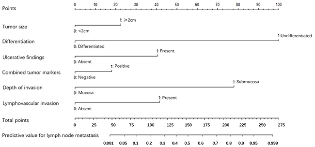 Figure 1: A nomogram composed of all the independent risk factors to predict the probability of lymph node metastasis for patients with early gastric cancer. The risk value of lymph node metastasis was calculated by drawing a vertical line to the point on the axis for each of the factors. The points for each factor were summed and located on the total point line. And then, the bottom line corresponding vertically to the above total line illustrated the individual predictive value for lymph node metastasis.