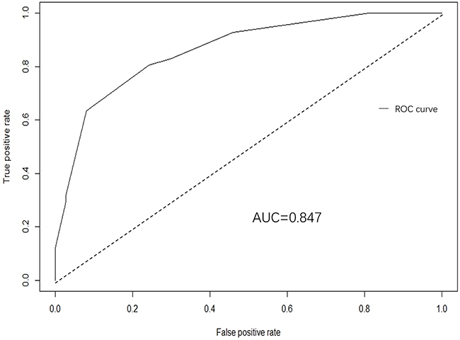 In order to assess whether this model was indeed trustworthy and evaluate how much improvement was gained using these clinicopathologic features and biomarkers in this study, we also validated several predictive models, composed of different factors which were reported in previous studies [7, 22-25], to generate several corresponding areas under the curve (AUC), as shown in Table 3. Furtherly, we compared them to the AUC produced by our predictive model in our study, and found that the AUC value was significantly larger than those produced in previous studies (all p<0.05, Table 3).