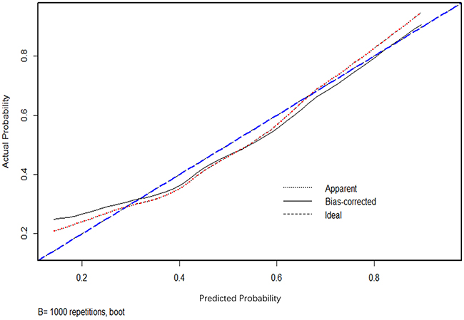 Figure 3: Calibration plot of nomogram. Dotted line (blue) indicated the ideal nomogram in which predicted and actual probabilities were perfectly identical; Dashed line (red) indicated actual nomogram performance with apparent accuracy; Solid line (black) presented bootstrap corrected performance of our nomogram, scatter estimate of future accuracy.