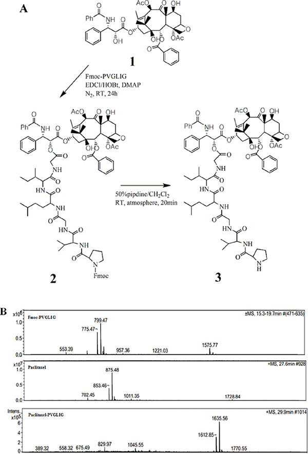 A novel hexapeptide, PVGLIG, was screened out since its high binding affinity to MMP2 protein. The peptide was then conjugated with paclitaxel for achieving improvement on tumor cells selectivity. In this study, paclitaxel was chemically linked to the COOH-terminus in peptide (Figure 1). Mass spectrophotometry was performed in order to monitor the reaction and to identify the final product (Figure 1).