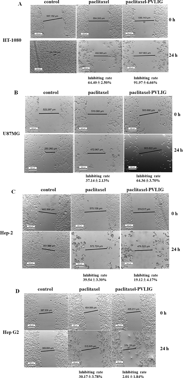 The HT-1080, U87MG, Hep G2 and Hep-2 cells were seeded in 6-well plates and cultured overnight. Following scraping of the cell layers in a straight line by a sterile p200 pipette tip, the debris was removed in two gentle rinses with PBS. Subsequently, 2.5 ml cell culture containing either free paclitaxel or conjuagte (final concentration at 5 μg/ml for paclitaxel) was plated. After 24 hours in a cell incubator, the distances between the two edges of the scratched cells were observed using Leica ICC50 HD microscopy (LEICA Microsystems Ltd, Switzerland). The apparent rate of inhibition was calculated using the following formula: inhibition rate (IR) = [(Distancetreated, 24 h - Distancetreated, 0 h) - (Distancecontrol, 24 h - Distancecontrol, 0 h)]/Distancetreated, 0 h × 100.