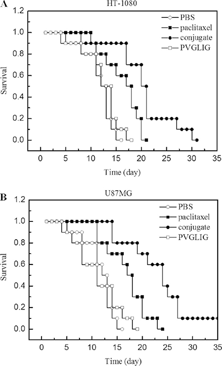 To evaluate the anti-tumour effect of conjugate and free paclitaxel, the mice bearing with tumours derived from either HT-1080 or U87MG cells were treated with conjugate (15 mg paclitaxel/kg body weight/5 day) and free paclitaxel (15 mg/kg body weight/5 day), respectively. The antitumor activities were determined by monitoring the animal survival rate during 30 days treatment. The results in Figure 4 revealed that the administration of conjugate significantly increased the survival rate of experimental mice.