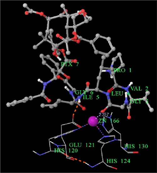 Figure 5: The molecular model of the interaction of conjugate and MMP2 protein. Legend: The Leu4, Ile5 and Gly6 residues interact with Zn2+ binding site in MMP2 protein, the residue His120, His 124, His130 and His 166.