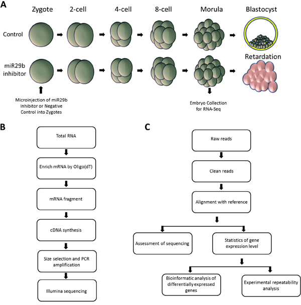 Figure 1: Experimental strategy for comparative transcriptome analysis. A. Schematic depiction of preimplantation development following microinjection of miR29b inhibitor or vehicle control. Embryos were collected at the morula stage; B. cDNA library build and sequencing; C. Workflow of standard bioinformatics analysis and validation.