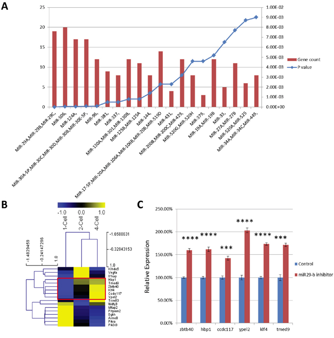 Figure 4: A. MicroRNA target analysis of UDEGs. Left and right Y-axes represent number of UDEGs and P-value of enrichment, respectively. B. Heat map cluster analysis of transcript levels of candidate genes in normal embryos at the 1-cell, 2-cell and 4-cell stage. Normalized FPKM values are represented from blue to yellow; C. Relative expression of 6 UDEGs in morula stage embryos that had been injected with miR-29b inhibitor (red) or mock control (blue) at the zygote stage. The 6 genes analyzed are normally upregulated during early preimplantation stages (marked by red box in B). ***, P-value < 10-3; ****, P-value < 10-4.