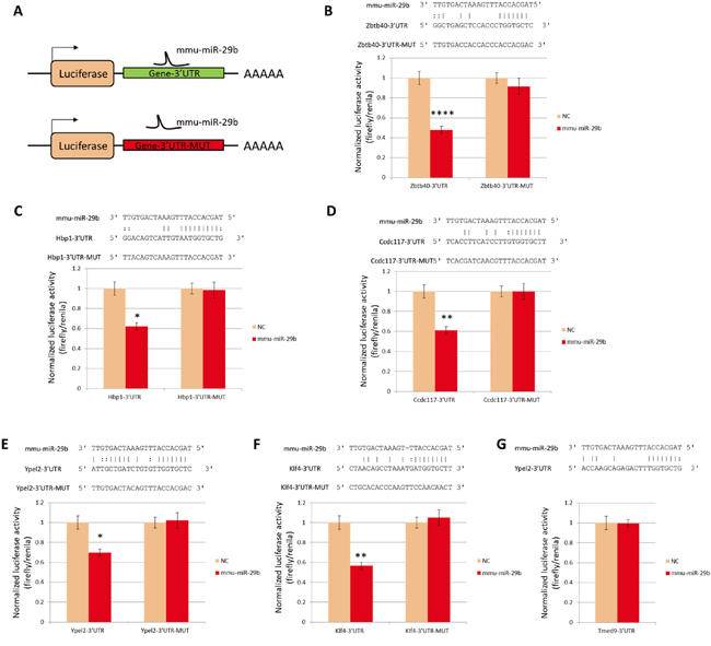 Figure 5: Luciferase reporter analysis of miR-29b targets. A. Schematic drawing of reporter constructs. B-G. Normalized reporter activity at 48 hours after co-transfection of constructs with mmu-miR-29b mimic or mock negative control (NC). Sequences illustrate predicted base pairing between miR-29b and the 3’UTR of target genes, and absence of complementarity of miR-29b with mutant target sequences used as negative controls. **: P<0.01. NC, (B) Zbtb40, (C) Hbp1, (D) Ccdc117, (E) Ypel2, (F) Klf4 and (G) Tmed9;