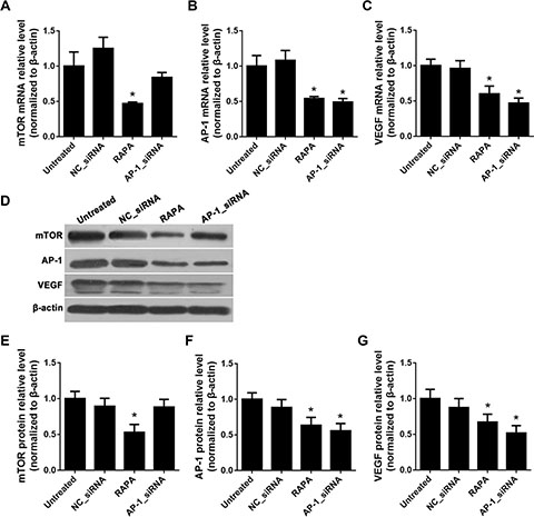 Figure 1: Effects of AP-1 downregulation on mTOR, AP-1, and VEGF expression. (A) mTOR mRNA levels after treatment with AP-1-siRNA or RAPA were detected by RT-qPCR, *p < 0.05 vs. untreated cells. (B) AP-1 mRNA levels after treatment with AP-1-siRNA or RAPA were detected by RT-qPCR, *p < 0.05 vs. untreated cells. (C) VEGF mRNA levels after treatment with AP-1-siRNA or RAPA were detected by RT-qPCR, *p < 0.05 vs. untreated cells. (D) mTOR, AP-1, and VEGF protein levels after treatment with AP-1-siRNA or RAPA were detected by Western blot. (E) Relative mTOR protein levels, *p < 0.05 vs. untreated cells. (F) Relative AP-1 protein levels, *p < 0.05 vs. untreated cells. (G) Relative VEGF protein levels, *p < 0.05 vs. untreated cells.