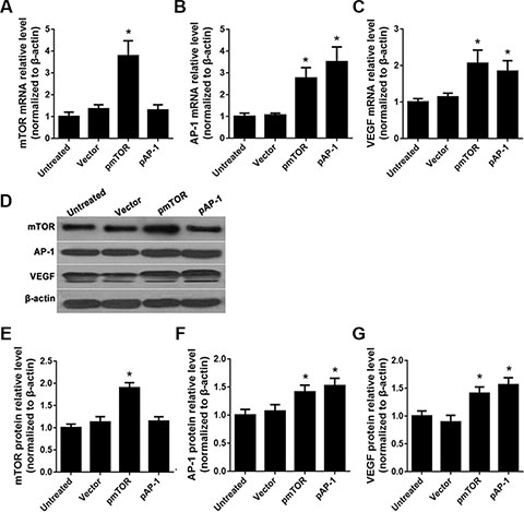 Figure 2: Effects of AP-1 and mTOR upregulation on mTOR, AP-1, and VEGF expression. (A) mTOR mRNA levels after treatment with pAP-1 or pmTOR were detected by RT-qPCR, *p < 0.05 vs. untreated cells. (B) AP-1 mRNA levels after treatment with pAP-1 or pmTOR were detected by RT-qPCR, *p < 0.05 vs. untreated cells. (C) VEGF mRNA levels after treatment with pAP-1 or pm TOR were detected by RT-qPCR, *p < 0.05 vs. untreated cells. (D) mTOR, AP-1, and VEGF protein levels after treatment with pAP-1 or pmTOR were detected by Western blot. (E) Relative mTOR protein levels, *p < 0.05 vs. untreated cells. (F) Relative AP-1 protein levels, *p < 0.05 vs. untreated cells. (G) Relative VEGF protein levels, *p < 0.05 vs. untreated cells.