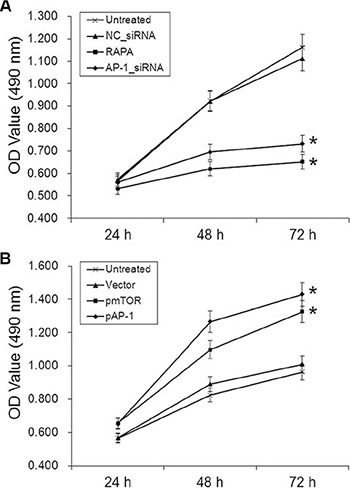 Figure 3: Effects of AP-1 or mTOR inhibition and overexpression on aortic endothelial cell proliferation. (A) Cell growth curves for all groups 24, 48, and 72 h after AP-1-siRNA or RAPA treatment, *p < 0.05 vs. untreated cells. (B) Cell growth curves for all groups 24, 48, and 72 h after pmTOR or pAP-1 treatment, *p < 0.05 vs. untreated cells.