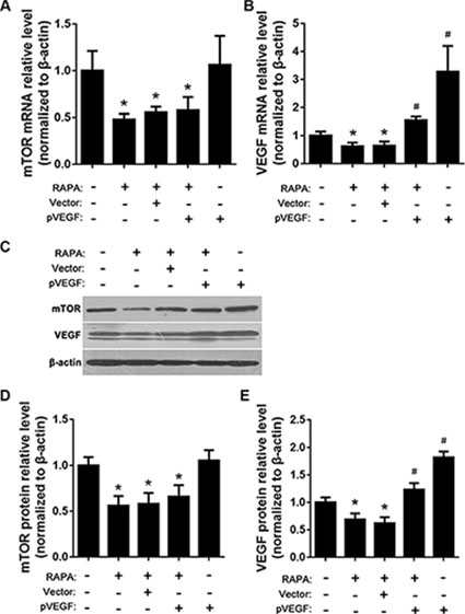 Figure 4: Effects of mTOR inhibition and VEGF overexpression on mTOR, AP-1, and VEGF expression. (A) mTOR mRNA levels after RAPA and/or pVEGF treatment were detected by RT-qPCR, *p < 0.05 vs. untreated cells. (B) VEGF mRNA levels after RAPA and/or pVEGF treatment were detected by RT-qPCR, *p < 0.05 VEGF low expression vs. untreated cells, #p < 0.05 VEGF high expression vs. untreated cells. (C) mTOR and VEGF protein levels after RAPA and/or pVEGF treatment were detected by Western blot. (D) Relative mTOR protein levels, *p < 0.05 vs. untreated cells. (E) Relative VEGF protein levels, *p < 0.05 VEGF low expression vs. untreated cells, #p < 0.05 VEGF high expression vs. untreated cells.
