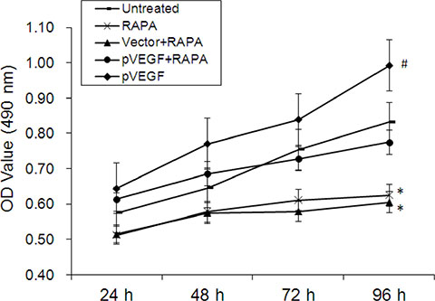 Figure 5: Effects of mTOR inhibition and VEGF overexpression on aortic endothelial cell proliferation. Cell growth curves for all groups 24, 48, 72, and 96 h after treatment, *p < 0.05 pVEGF vs. untreated cells, #p < 0.05, RAPA or empty vector combined with RAPA (vector+RAPA) vs. untreated cells. Proliferation did not differ between untreated cells and cells treated with pVEGF combined with RAPA (pVEGF+RAPA) (p > 0.05).