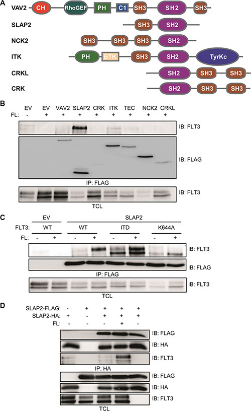 Figure 1: SLAP2 associated with FLT3 in response to FL. (A) Structure of several SH2 domain-containing proteins. (B–C) COS-1 cells were transfected with plasmids expressing FLT3-WT and empty vector or VAV2 or SLAP2 or CRK or ITK or TEC or NCK or CRKL (B). COS-1 cells were transfected with plasmids expressing FLT3-WT or FLT3-ITD or FLT3-K644A and empty vector or SLAP2 (C). One day after transfection cells were stimulated for 5 minutes with 100 ng/ml FL followed by lysis. Lysates were subjected to anti-FLAG immunoprecipitations. (D) COS-1 cells were transfected with plasmids expressing SLAP2-FLAG and SLAP2-HA. One day after transfection cells were stimulated for 5 minutes with 100 ng/ml FL followed by lysis. Lysates were subjected to anti-HA immunoprecipitations.