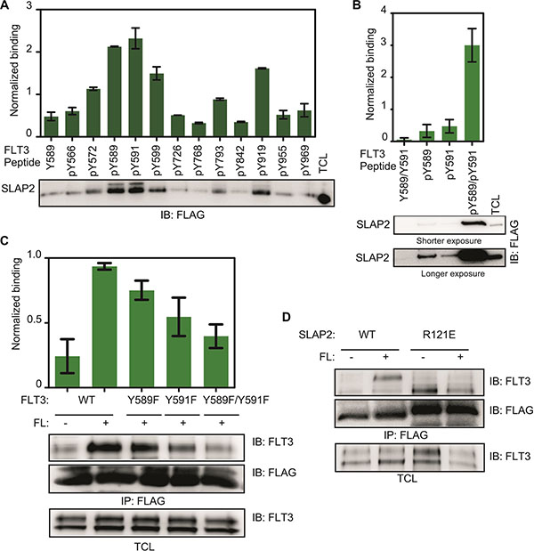 Figure 2: SLAP2 SH2 domain associated with FLT3 phospho-tyrosine residues. (A–B) COS-1 cells were transfected with a plasmid expressing SLAP2-FLAG. Cells were lysed one day after transfection and lysates were mixed with immobilized FLT3 phosphopeptides for 30 minutes. Beads were then washed with lysis buffer for four times and subjected to Western blotting analysis, (C–D) COS-1 cells were transfected with plasmids expressing SLAP2-FLAG and FLT3-WT or FLT3-WT-Y589F or FLT3-WT-Y591F or FLT3-WT-Y589F/Y591F (C). COS-1 cells were transfected with plasmids expressing FLT3-WT or SLAP2-WT-FLAG or SLAP2-R121E-FLAG (D) One day after transfection cells were stimulated for 5 minutes with 100 ng/ml FL followed by lysis. Lysates were subjected to anti-FLAG immunoprecipitations.