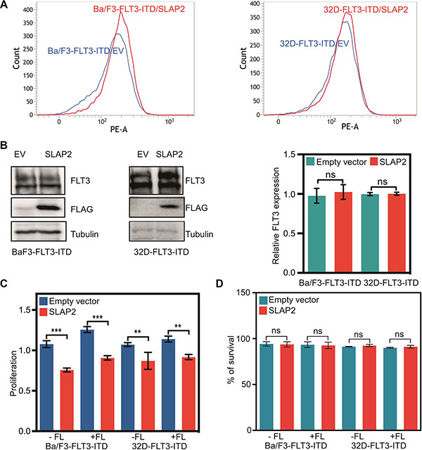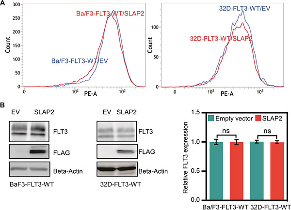 Figure 6: Ba/F3 and 32D cell lines expressing wild-type FLT3 and SLAP2. (A) Ba/F3 and 32D cells expressing FLT3 and SLAP2 or empty vector were labeled with phycoerythrin-conjugated anti-FLT3 and then analyzed by flow cytometry. (B) An equal amount of cells were lysed, and lysates were subjected to Western blotting analysis. Blots from multiple experiments were quantified for statistical analysis. ns, not significant.