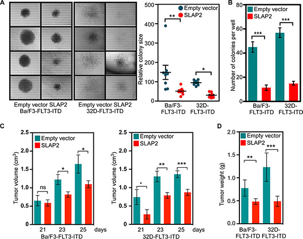 Figure 4: SLAP2 expression reduces FLT3-induced colony formation and tumor formation. (A–B) Cells were washed to remove IL3 and then mixed with methylcellulose medium before seeding in a 24-well plate. Cells were incubated for 7 days. Area of colonies was measured using ImageJ (C–D) Cells were washed and xenografted into mice. Tumor growth was monitored for 25 days. ns, not significant; *p < 0.05; **p < 0.01; ***p < 0.001.