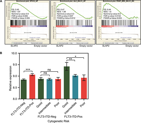 Figure 5: SLAP2 expression led to better survival in FLT3-ITD positive AML. (A) GESA analysis using mRNA expression of Ba/F3 and 32D cells expressing SLAP2 or empty vector. (B) Relative SLAP2 expression in FLT3-ITD positive or negative AML patients. ns, not significant; *p < 0.05; **p < 0.01; ***p < 0.001.