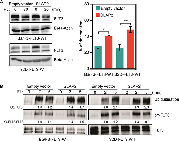 Figure 8: SLAP2 expression accelerated FLT3 degradation through enhanced ubiquitination. (A) Cells were washed to remove IL3 and incubated with cycloheximide before FL stimulation. Total cell lysates were used for SDS-PAGE and Western blotting analysis. Multiple blots were quantified for statistical analysis. *p < 0.05; **p < 0.01. (B) Cells were washed and starved for 4 hours before stimulation with FL for different time points. Cell lysates were subjected to an anti-FLT3 immunoprecipitation followed by SDS-PAGE and Western blotting analysis.