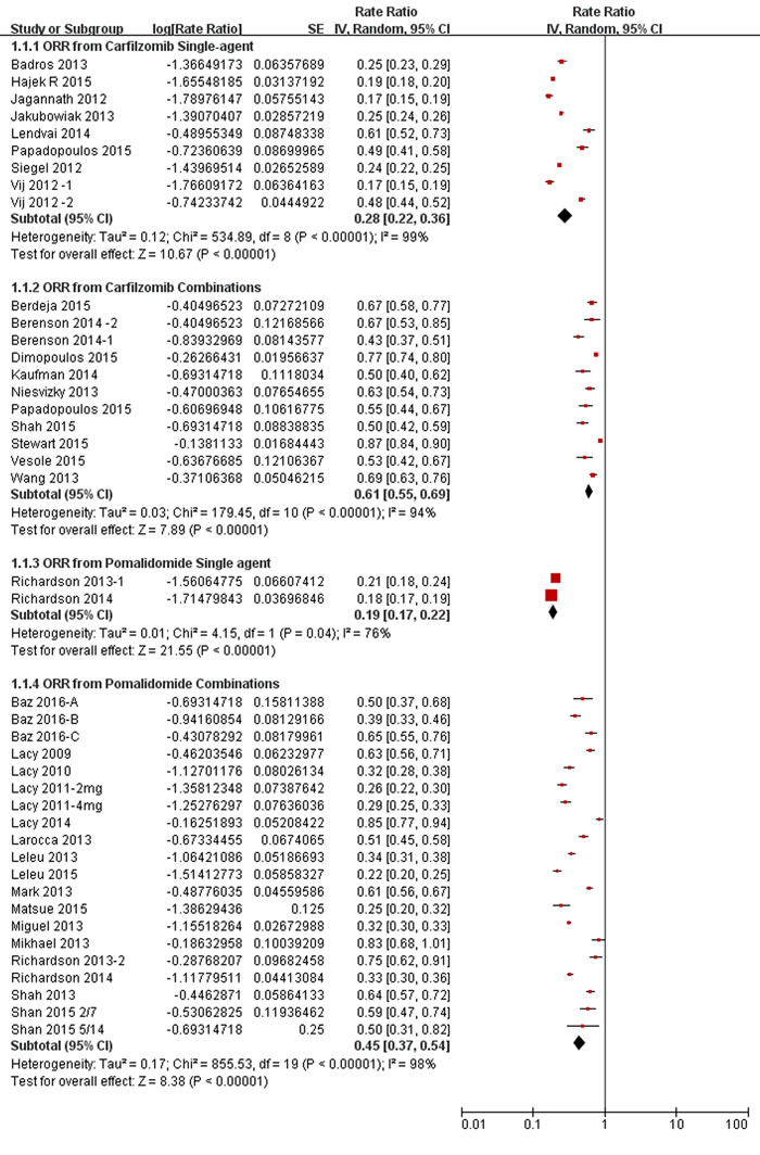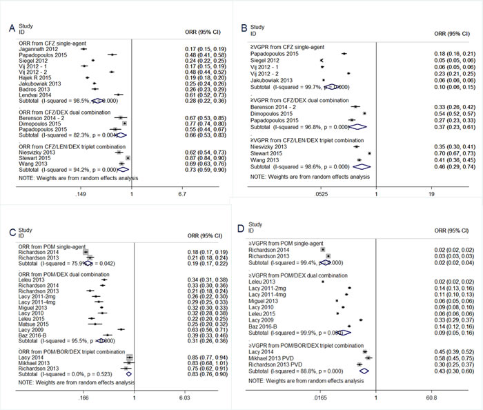 We undertook subgoup analysis based on pomalidomide regimens (single-agent, POM/DEX dual combination, POM/BOR/DEX triplet combination), as shown in Figure 2 and Table 2. Analysis of subgroup differences between pomalidomide single-agent and POM/DEX dual combination showed significantly (P < 0.001, I2 = 94.4%), suggesting the overall response rate (ORR) of 31% attained from POM/DEX dual combination seems to be higher than that of 19% from carfilzomib single-agent. And, the same trend favoring POM/DEX dual combination in≥VGPR and SDR analysis. POM/BOR/DEX triplet combination resulted into a superior ORR of 83% to that of 31% from POM/DEX dual combination(P < 0.001, I2 = 99.1%) (Table 2). And, a similar trend favoring POM/BOR/DEX triplet combination in ≥VGPR and SDR analysis.
