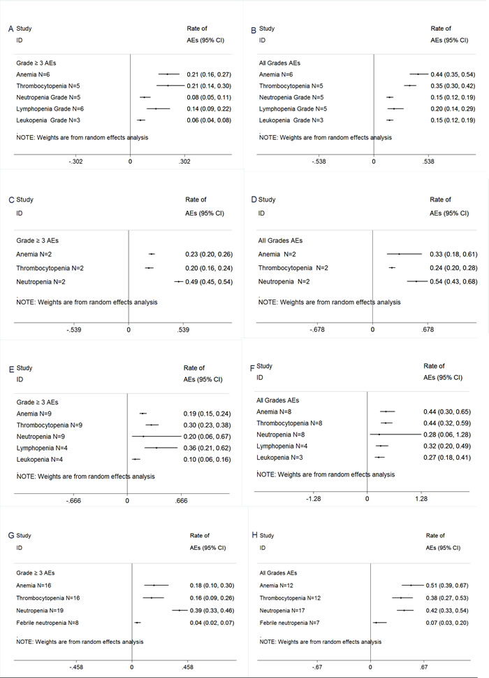 Figure 3: Meta-analysis of hematologic adverse events (AEs) with carfilzomib and pomalidomide for the management of patients with RRMM.. (A)≥Grade 3 hematologic AEs with carfilzomib single-agent. (B) All grades hematologic AEs with carfilzomib single-agent. (C) ≥Grade 3 hematologic AEs with pomalidomide single-agent.. (D) All grades hematologic AEs with pomalidomide single-agent. (E) ≥Grade 3 hematologic AEs with carfilzomib combinations.(F) All grades hematologic AEs with carfilzomib combinations.(G) ≥Grade 3 hematologic AEs with pomalidomide combinations.(H) All grades hematologic AEs with pomalidomide combinations.