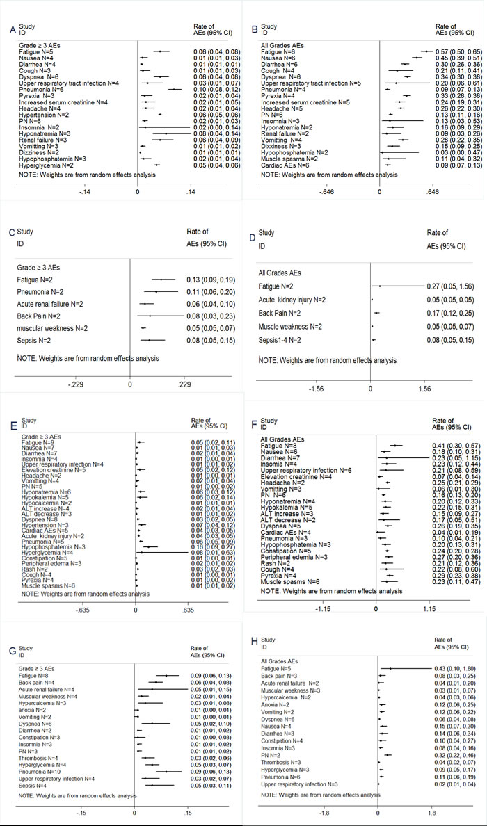 Figure 4: Meta-analysis of non-hematologic adverse events (AEs) with carfilzomib and pomalidomide for the management of patients with RRMM. (A)≥Grade 3 non-hematologic AEs with carfilzomib single-agent. (B) All grades non-hematologic AEs with carfilzomib single-agent. (C) ≥Grade 3 non-hematologic AEs with pomalidomide single-agent. (D) All grades non-hematologic AEs with pomalidomide single-agent. (E) ≥Grade 3 non-hematologic AEs with carfilzomib combinations.(F) All grades non-hematologic AEs with carfilzomib combinations.(G) ≥Grade 3 non-hematologic AEs with pomalidomide combinations. (H) All grades non-hematologic AEs with pomalidomide combinations.