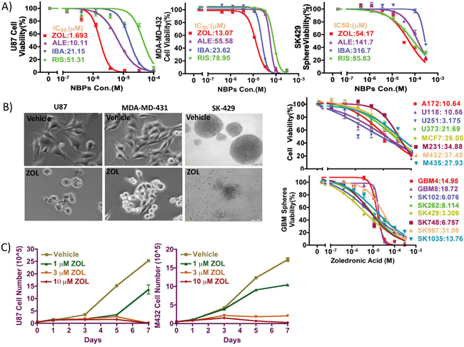 Figure 1: Inhibitory effect of NBPs against tumor cells proliferation in vitro. A. The anti-proliferative effect of 4 clinically available NBPs was tested against against glioma cells, breast cancer cells, and patient-derived glioma neurospheres using alamar blue assay. ZOL showed the lowest IC50 values, as compared to other NBPs in all cell types tested. B. ZOL broadly inhibits cancer cell lines proliferation, as demonstrated by its effect on morphology and representative dose-response curves. C. To determine effect of ZOL on viability, cells were treated with ZOL for 1, 3, 5 and 7 days, after which cells were counted using trypan blue exclusion assay. Following ZOL treatment, U87 and MDA-MD-432 cell numbers decreased.