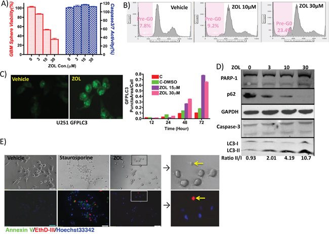 Figure 2: Induction of cell cycle arrest and cell autophagy by ZOL treatment. A. Cell viability was examined by alamar blue assay and caspase-3/7 activity using Apo-One Kit, following treatment with increasing doses of ZOL (0, 3, 10, and 30 μM). Cell viability decreased but without a detectable apoptotic signal. B. Effect of ZOL on cell cycle was studied using flow cytometry and quantifying percentage of pre-G0 cells. ZOL treatment induced cell cycle arrest – pre-phase cells increased from 7.8% (control) to 9.2% (10 μM ZOL) and 23.4% (30 μM ZOL). C. ZOL induced autophagosome accumulation showed by U251-GFPLC3 puncta formation in tumor cell, when compared to control cells where GFPLC3 is evenly distributed in the cytoplasm. Cells are visualized by fluorescence microscopy, and the puncta in cells are quantified in 5 randomly selected fields. D. Western blotting analysis to detect PARP-1 and caspase 3 (apoptotic signals) and LC3-II/I conversion and p62 degradation (autophagy signals) following ZOL treatment (0, 10, and 30 μM ZOL). E. Annexin V staining phosphatidylserine (PS) on the surface of apoptotic cells with green fluorescence. EthD-III stains necrotic cells and late apoptotic cells with red fluorescence. Hoechst33342 stain the entire cell population with blue fluorescence. Staurosporine-treated cells serve as positive control for apoptosis. After ZOL treatment, U87 cells did not demonstrate any apoptotic and necrotic signals.