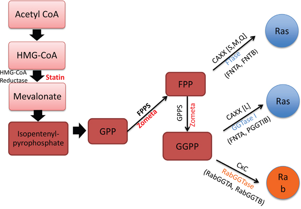 Figure 5: Mevalonate synthesis pathway and related prenyl-transferases. This cartoon depicts the sites of action of ZOL and statins targeting the mevalonate synthesis pathway. The intermediates in this pathway, FPP and GGPP also modify Ras and Rab proteins. The prenyltransferases include FTase, GGTase-1 and RabGGTase: FTase encoded by FNTA and FNTB gene, GGTase-1 encoded by FNTA and PGGT1B, and RabGGTase encoded by RabGGTA and RabGGTB.