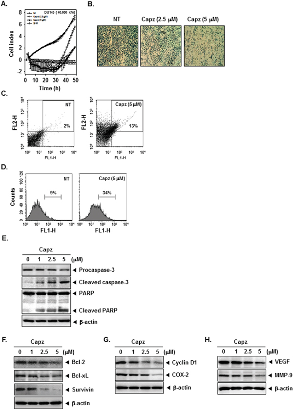Figure 3: Capz inhibits invasion and promotes apoptosis in prostate cancer cells. A. An invasion assay was performed using the Roche xCELLigence Real-Time Cell Analyzer (RTCA) DP instrument (Roche Diagnostics GmbH, Germany). DU145 cell invasion activity (4 × 104 cells/well) was measured in a matrigel-coated CIM (cellular invasion/migration)-Plate 16 with the indicated concentrations of Capz. B. DU145 cells were seeded in a matrigel invasion chamber overnight in the absence of a serum, incubated with the indicated concentrations of Capz for 24 h, and then subjected to the invasion assay. Representative photographs of stained cells on the lower side of matrigel membrane from one of the three experiments are shown. C. DU145 cells (1 × 106 cells/well) were treated with 5 μM of Capz for 24 h. The cells were incubated with a FITC-conjugated Annexin V antibody and then analyzed by flow cytometry. D. DU145 cells (1 × 106 cells/well) were seeded into 6 well plates and treated with 5 μM of Capz for 24 h. The cells were fixed and incubated with TUNEL reaction solution and then analyzed by flow cytometry. E. DU145 cells (1 × 106 cells/well) were treated with the indicated concentrations of Capz for 24 h. Whole-cell extracts were prepared; 20 μg portions of those extracts were resolved via 10% SDS-PAGE and probed with pro-caspase-3, cleaved caspase-3, and PARP antibodies. The same blots were stripped and reprobed with β-actin antibody to verify equal protein loading. F. Equal amounts of lysates were analyzed by Western blot using antibodies against Bcl-2, Bcl-xl, and Survivin. The same blots were stripped and reprobed with β-actin antibody to verify equal protein loading. G. Equal amounts of lysates were analyzed by Western blot using antibodies against Cyclin D1 and COX-2. The same blots were stripped and reprobed with β-actin antibody to verify equal protein loading. H. Equal amounts of lysates were analyzed by Western blot using antibodies against VEGF and MMP-9. The same blots were stripped and reprobed with β-actin antibody to verify equal protein loading. The results shown are representative of two independent experiments.