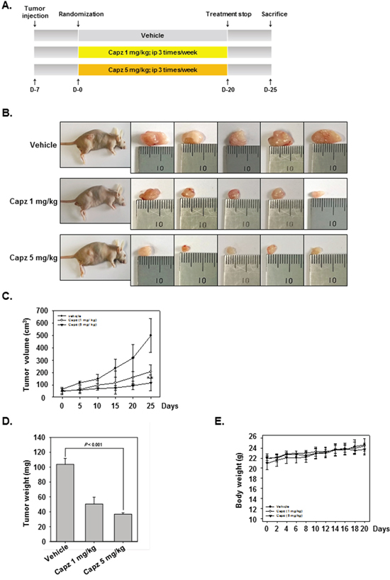 Figure 4: Antitumor effects of Capz in human prostate cancer xenograft mouse model. A. Aschematic representation of the experimental protocol. DU145 cells (1× 107 cells/mice) were injected subcutaneously into the right flanks of the mice. The animals were randomized into three groups 1 week after tumor cell injection based on tumor volume. Group I (control) was treated with PBS (100 μL i.p. 3 times/week), group II with Capz (1 mg/kg i.p. 3 times/week), and group III with Capz (5 mg/kg i.p. 3 times/week) (n = 8). B. Necropsy photographs of mice bearing subcutaneously implanted prostate tumors. C. Tumor diameters were measured every 5 days with Digimatic calipers, and tumor volumes were calculated using the formula V = 4/3 πr3 (n = 8). D. Tumor volumes (mean ± SE) based on tumor diameters measured on the last day of the experiment at autopsy using Digimatic calipers. E. Capz did not alter body weights, indicating the doses used were not toxic.