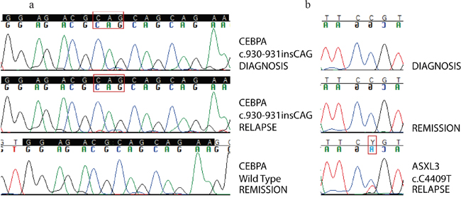 Figure 2: Sanger sequencing validation of somatic mutations. Panel 2a: Sanger validation of biCEBPα mutation in patient AML#2. Homozygous CAG in-frame insertion is detected in the whole tumor population both at diagnosis and at relapse, while is not detected in remission sample used as germinal counterpart. High coverage targeted deep sequencing was actually able to detect a very small clone (< 0,1%) carrying this mutation persisting at remission. Panel 2b: Sanger validation of ASXL3 mutation in patient AML#2. Point mutation c.C4409T is detected only at relapse. Backtracking of this mutation through high coverage targeted deep sequencing was able to detect a minor subclone carrying this mutation even at diagnosis.