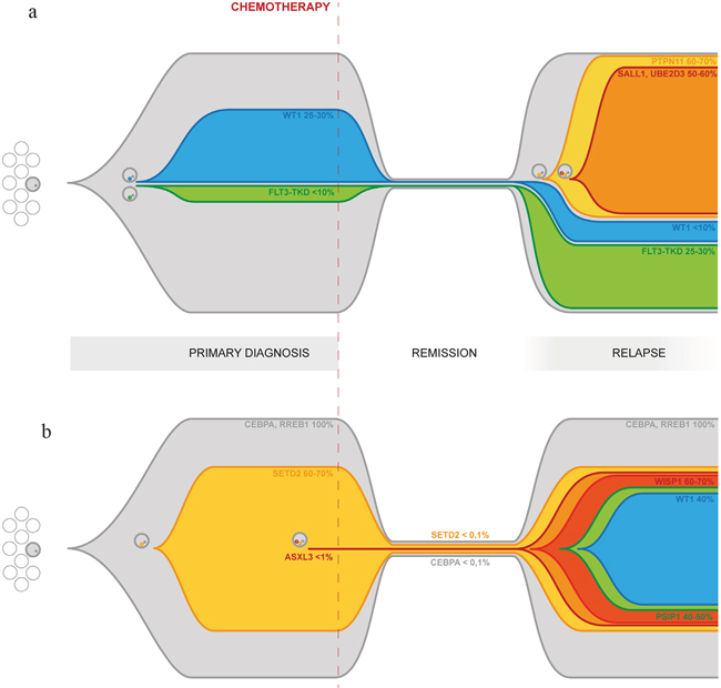 Figure 3: Graphical representation of clonal evolution from primary diagnosis to relapse based on targeted deep sequencing of driver mutations. Panel 3a: Clonal evolution in patient AML#3. The primary tumor differentiates into subclones through the acquisition of new somatic mutations, including WT1 and FLT3-TKD. Those clones survive chemotherapy and contribute to relapse. Later acquisition of additional mutations, such as PTPN11, SALL1 and UBE2D3, further increases clonal heterogeneity and confers a higher degree of complexity to the disease. Reported percentages refer to the estimated size population of each clone inferred from the MF calculated on targeted deep sequencing data for each mutation and adjusted for CN. Panel 3b: Clonal evolution in patient AML#2. The entire tumor population both in the primary and in the relapse samples carries a biCEBPα and a RREB1 mutation. The inactivation of SETD2 in a substantial fraction of the cells is associated with the acquisition of a mutator phenotype causing differentiation into multiple minor subclones through the acquisition of additional somatic mutations, increasing the plasticity and adaptability of the leukemia. High coverage targeted deep sequencing was able to detect persistence of biCEBPAα and SETD2 mutation during remission. Reported percentages refer to the estimated size population of each clone inferred from the MF calculated on targeted deep sequencing data for each mutation and adjusted for CN.