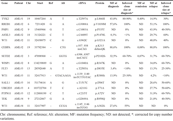 Outcome of children with acute myeloid leukemia (AML) has improved significantly over the past 30 years [1]. Although the majority of patients reach complete remission with intensive chemotherapy [2] [3] [4], about 30% of children with AML experience disease recurrence [5] [6]. The outcome of these patients is poor, with a probability of overall survival (pOS) ranging between 29% and 38% [5] [6] [7], making relapsed AML a striking challenge and the leading cause of death in these children. Given the high frequency of treatment-related deaths (5%–10%), both with first-line treatment and with protocols for relapsed disease, further intensification of standard chemotherapy does not seem to be an option for further improvement of patients' outcome [8]. This said, better knowledge of the molecular lesions underlying AML and especially of those involved in the development of relapse is mandatory in order to devise novel patient-specific treatment strategies. Based on recent studies, disease recurrence seems to be associated with clonal evolution from early stage to relapse, promoted at least in part by chemotherapy itself. This model is supported by the seminal work of Ding et al [9] in adult AML, and has only recently been confirmed by Farrar et al [10] in childhood AML. These authors detected different subclones within the whole tumor population which were characterized by the acquisition of additional mutations. The unequal fitness for survival of various subclones provides them with different capability of escaping chemotherapy, this leading to relapse. To gain deeper knowledge on the molecular mechanisms underlying relapse, we performed whole-exome sequencing (WES) of primary tumor-relapse pairs and matched remission samples from 4 pediatric AML patients. Candidate driver somatic events were identified and selected for targeted deep sequencing, a sensitive assay capable to detect their presence throughout the various phases of the disease and to track the dynamics of evolution of the various subclones. We focused on cases without recurrent cytogenetic alterations, which represent about 20% of childhood AML. In this group of patients, adequate molecular characterization, risk stratification and disease monitoring remain difficult tasks, this leading to a great variability in terms of response to therapy and final prognosis.