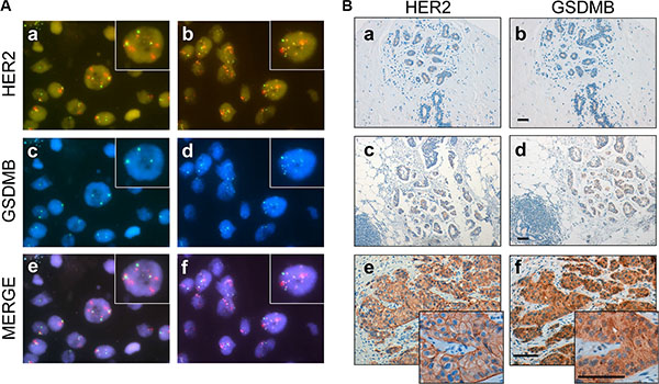 Figure 2: GSDMB gene amplification and protein expression in HER2-positive breast cancer. (A) Representative breast tumours with positive and negative HER2 and GSDMB amplification. Panels a, c, e: represent an example of breast carcinoma HER2-positive (red signal) without GSDMB amplification. Panels b, d, f: represent an example of case HER2-positive with GSDMB amplification (blue signal). The lower lane shows the merged image (e of a-c and f of b-d panels). Green signals represent CEP7. Magnification x 63x; insets x 120. (B) Immunohistochemical analysis of HER2 and GSDMB in normal tissue (panel a, b), and in breast carcinoma cases (panels c–f). Low or undetectable GSDMB staining was observed in normal breast tissue (b) or in lesions with GSDMB gene copy number of < 4 signals/nucleus (d) (considered non-amplified tumours). Intense GSDMB staining in a case with > 10 GSDMB copy number (f) considered as GSDMB-positive tumour. Scale bar measures 100 micrometers.