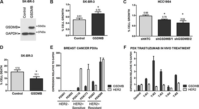 Altogether, these data demonstrate that GSDMB overexpression is functionally involved in promoting resistance to the anti-HER2 inmunotherapy trastuzumab, and this may explain its association with adverse clinical behaviour in HER2+ cancers.