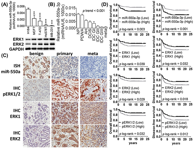 Figure 1: The expression of miR-550a-3p is downregulated in breast cancer and negatively corrected with ERK1 and ERK2. The relative expression levels of miR-550a-3p were detected by the stem-loop based miRNA real-time PCR (normalized to U6) in A. breast cell lines (H184B5F5/M10 was used as the baseline of comparison, *p < 0.05, **p < 0.01, ***p < 0.001, Student t-test). And ERK1 and ERK2 expression levels of each breast cancer cells were evaluated with western blot. B. The relative expression levels of miR-550a-3p were also detected by the stem-loop based miRNA real-time PCR in breast tissue specimens (twenty liquid-nitorgen storaged specimens of each group were analyzed, p trend test < 0.001, one-way ANOVA contrasts in a polynomial model). MiR-550a-3p was downregulated in breast cancer cell lines and tissues than normal controls. And lower miR-550a-3p was observed in poorer differentiated breast cancer cell lines or more aggressive breast cancer specimens. C. Representative expression profiles of miR-550a-3p, ERK1, ERK2, and p-ERK1/2 among formalin-fixed paraffin-embedded specimens of benign breast diseases, primary breast cancer and lymph node metastatic breast cancers. D. Kaplan-Meier curves of overall survival (OS) and disease-free survival (DFS) were analyzed with log-rank test. And higher miR-550a-3p (p = 0.003 for OS and p = 0.001 for DFS), lower ERK1 (p = 0.039 for OS and p = 0.032 for DFS), lower ERK2 (p = 0.029 for OS and p = 0.018 for DFS), and lower p-ERK1/2 (p = 0.032 for OS and p = 0.012 for DFS) carriers had better survival rate. Abbrev: NP: non-proliferative lesion, PDWA: proliferative disease without atypia, AH: atypical hyperplasia, DCIS: ductal carcinoma in situ, IDC GI: infiltrating ductal carcinoma grade I, IDC GII: infiltrating ductal carcinoma grade II, IDC GIII: infiltrating ductal carcinoma grade III, meta: lymph node metastatic breast cancer. ISH: in situ hybridization, IHC: immunohistochemistry.