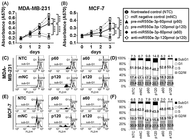 Figure 2: The effects of miR-550a-3p on cell viability and apoptosis were evaluated in MDA-MB-231 and MCF-7 cells. A. MDA-MB-231 and B. MCF-7 cells were treated with six different conditions, non-treated control (NTC), 120 pmol miRNA negative controls (mNC), 60 pmol pre-miR-550a-3p (p60), 120 pmol pre-miR-550a-3p (p120), 60 pmol anti-miR-550a-3p (a60), and 120 pmol anti-miR-550a-3p (a120) for 72 h, and the cell viability was determined using MTT assay. It indicated that pre-miR-550a-3p inhibited cell viability in a dose-dependent manner, and otherwise anti-miR-550a-3p increased cell viability in a dose-dependent manner. C, D. MDA-MB-231 and E, F. MCF-7 cells were treated with the same six conditions, and sub-G1 area of PI-stained flowcytometry was considered as apoptotic cell population. It indicated that pre-miR-550a-3p increased sub-G1 area in a dose-dependent manner, and otherwise anti-miR-550a-3p reduced sub-G1 area in a dose-dependent manner.