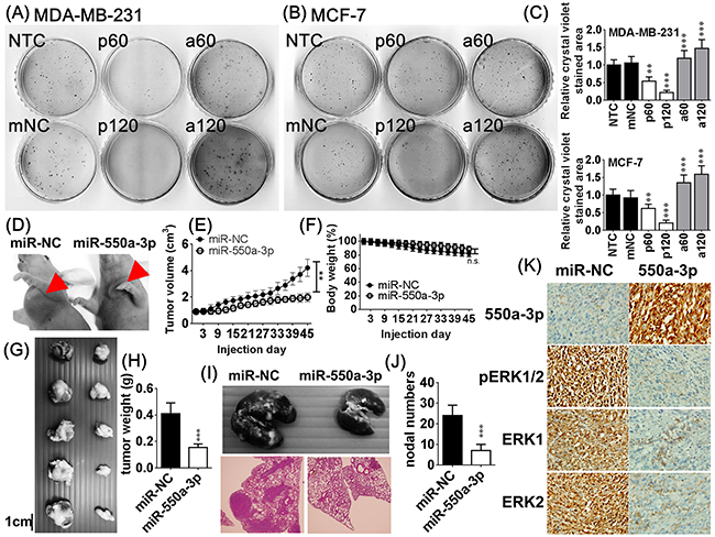 Figure 4: The effects of miR-550a-3p on in vitro and in vivo tumorigenesis. After treated with the same six conditions of Figure 2 for 72 h, in vitro tumorigenesis was evaluated with softagar colony-forming assay in A. MDA-MB-231 and B. MCF-7. C. The bar-chart was used to show the colony numbers of each group and the NC group was used as the comparative group (*p < 0.05, **p < 0.01, ***p < 0.001, Student t-test). Pre-miR-550a-3p decreased colony numbers in a dose-dependent manner but anti-miR-550a-3p increased colony numbers in a dose-dependent manner. D. After MDA-MB-231 cells transfected with agomiR-550a-3p (5 μM) or agomiR-NC (5 μM) for 72 h, 1×107 cells were injected subcutaneously and orthotopically into the axillary fossae of each female Balb/c nude mouse for 45 days (n = 5 for each group). E. AgomiR-550a-3p significantly reduced tumor volume but not modified F. body weight compared to the agomiR-NC transfected group. G, H. AgomiR-550a-3p also significantly reduced tumor weight compared to the agomiR-NC transfected group. Data are mean ± SD of quintuple experiments (**p < 0.01, ***p < 0.001, Student t-test). I, J. In metastasis assays, 2 × 107 MDA-MB-231 cells transfected with agomiR-550a-3p (5 μM) or agomiR-NC (5 μM) were injected into the lateral tail veins of each mouse and allowed to colonize for 8 weeks (n = 5 for each group). AgomiR-550a-3p significantly reduced metastatic nodal numbers in lung compared to the agomiR-NC transfected group. Data are mean ± SD of quintuple experiments (**p < 0.01, ***p < 0.001, Student t-test). K. Representative results of in situ hybridization of miR-550a-3p and immunohistochemistry of ERK1, ERK2, and pERK1/2 in xenograft tumors.