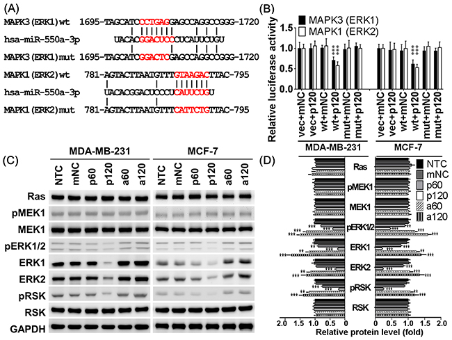 Figure 5: MiR-550a-3p downregulated ERK1 and ERK2 by directly targeting their 3’UTR. A. The putative binding sequences for miR-550a-3p within the 3’UTR of MAPK1 (ERK2) and MAPK3 (ERK1) were aligned as indicated, and the mutated sites were designed upon the completely complementary sequences. B. After co-transfection with the pre-miR-550a-3p or miRNA negative controls (mNC), the relative luciferase activity of pMIR-Reporter luciferase reporters carring wild-type or mutant 3’UTR of MAPK1 (ERK2) and MAPK3 (ERK1) was determined in MDA-MB-231 and MCF-7 cells under normalization with the empty vector transfectants. β-Galactosidase control vector was also co-transfected as a transfection loading control. Pre-miR-550a-3p reduced luciferase activity in cells transfected with p-MIR-Reporter carrying wild-type ERK1 or ERK2 3’UTR, but there was no influence observed in cells transfected with vector alone orp-MIR-Reporter carryingmutantERK1 or ERK2 3’UTR. Data were shown as the mean ± SD. C. The protein levels of Ras/ERK signaling molecules were determined with western blot in MDA-MB-231 and MCF-7. Pre-miR-550a-3p decreased ERK1, ERK2, pERK1/2 and their downstream effect pRSK in a dose-dependent manner, but it conferred no effect on their upstream regulators, Ras, MEK1, and pMEK1. Otherwise, anti-miR-550a-3p slightly recovered the protein expression of ERK1 and ERK2 and therefore increased pERK1/2 and pRSK in a dose-dependent manner, but it conferred no effect on Ras, MEK1, and pMEK1. D. The bar-chart was used to show the relative protein levels which were normalized with GAPDH and the NTC group was used as the comparative baseline (*p < 0.05, **p < 0.01, ***p < 0.001, Student t-test). Abbrev: NTC: non-treated control, mNC: 120 pmol miRNA negative controls, p60: 60 pmol pre-miR-550a-3p, p120: 120 pmol pre-miR-550a-3p, a60: 60 pmol anti-miR-550a-3p, and p120: 120 pmol anti-miR-550a-3p.