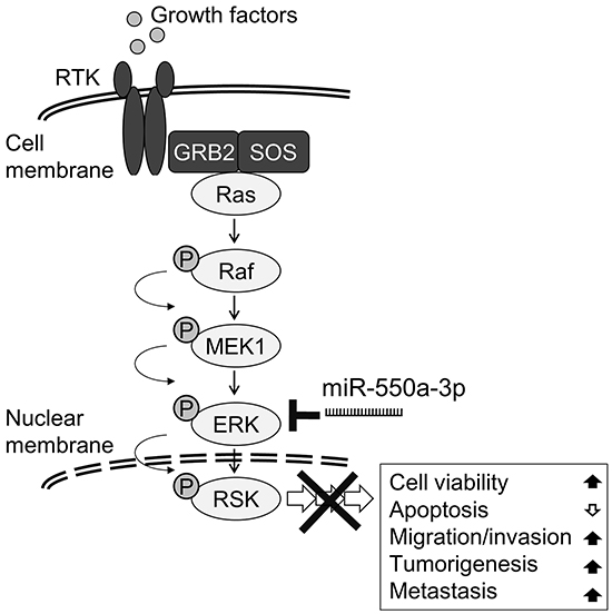 Figure 8: Schematic diagram of miR-550a-3p inhibits Ras/ERK signaling pathway by directly targeting ERK1 and ERK2. MiR-550a-3p exerts its tumor-suppressor role by directly targeting and repressing ERK1 and ERK2 and thereby suppresses the oncogenic ERK/RSK cascades, reducing cell viability, survival, migration, invasion, tumorigenesis, and metastasis in breast cancer cells.