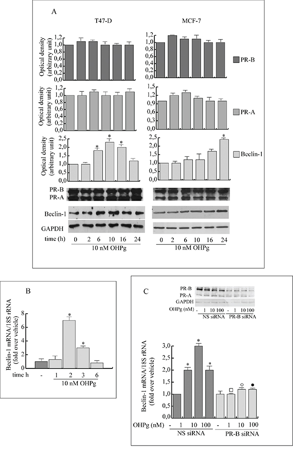 Figure 1: OHPg through PR-B up-regulates Beclin-1 protein and mRNA levels in breast cancer cells. A. Western blotting analysis of Beclin-1, PR-A and PR-B. T47-D and MCF-7 breast cancer cells treated with 10 nM OHPg at different times as indicated. GAPDH was used as loading control. Autoradiograph shows the results of one representative experiment out of three. B. Real-time PCR assay of Beclin-1 mRNA expression in T47-D cells treated at different times as indicated. C. Real-time PCR assay of Beclin-1 mRNA expression in MCF-7 cells transfected with non specific (NS)- or targeted against PR-B siRNA treated with vehicle (-) or OHPg for 24h as indicated. 18S rRNA was determined as control. Columns are the mean of three independent experiments each in triplicate; bars, SD; * p ≤0.05 vs vehicle treated cells; ▪ p ≤0.05 vs. 1 nM OHPg; ○ p ≤0.05 vs. 10 nM OHPg ● p ≤0.05 vs 100 nM OHPg. In the insert, Western blotting analysis of PR-B expression in MCF-7 cells in the same experimental conditions. GAPDH was used as loading control.
