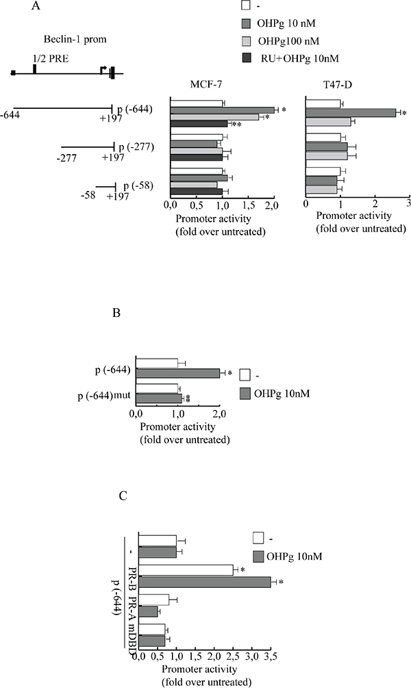 Figure 2: OHPg transactivates Beclin-1 promoter gene in breast cancer cells. A. left panel. Schematic representation of deletion fragments of the Beclin-1 gene promoter. Right panel. Constructs depicted were transiently transfected in MCF-7 and T47-D cells, treated with vehicle (−) or OHPg or 1μM RU 486 +10 nM OHPg as indicated. Columns are mean of three independent experiments and expressed as fold change over untreated, which was assumed to be 1; bars SD; * p ≤0.05 vs vehicle. ** p ≤0.05 vs OHPg 10 nM B. Site-directed mutagenesis of the 1/2PRE site. p(-644) and p(-644) mut promoter constructs were transfected into MCF-7 cells, and activity was assessed in the absence or presence of 10 nM OHPg. After 24 h, cells were harvested and luciferase activities were determined; bars SD; * p ≤0.05 vs vehicle. ** p ≤0.05 vs p(-644) 10 nM OHPg. C. MDA-MB231 cells were co-transfected with the Beclin-1 promoter construct p(-644) and PR-B or PR-A or mDBD expression vector, and then treated for 24 h with vehicle (-) or 10 nM OHPg; bars, SD; * p ≤0.05 vs vehicle.