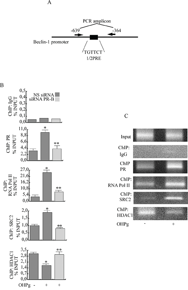 Figure 3: Ligand-activated PR-B binds the Beclin-1 gene promoter together with SRC-2 coactivator. A. Schematic representation of Beclin-1 promoter region containing the 1/2PRE site. B. ChIP-qPCR. MCF-7 cells transfected with non specific (NS) or targeted against PR-B siRNA treated with vehicle (−) or 10 nM OHPg. ChIP-qPCR was performed using primers as depicted in (A) and antibodies are used as indicated. IgG was used as control. Columns are the mean of three independent experiments. bars, SD; * p ≤0.05 vs vehicle. ** p ≤0.05 vs 10 nM OHPg. C. ChIP assay. T47-D treated with vehicle (−) or 10 nM OHPg. DNA Input, loading control. PCR was performed using primers as depicted in (A) antibodies are used as indicated. IgG was used as control. Images are representative of three independent experiments.