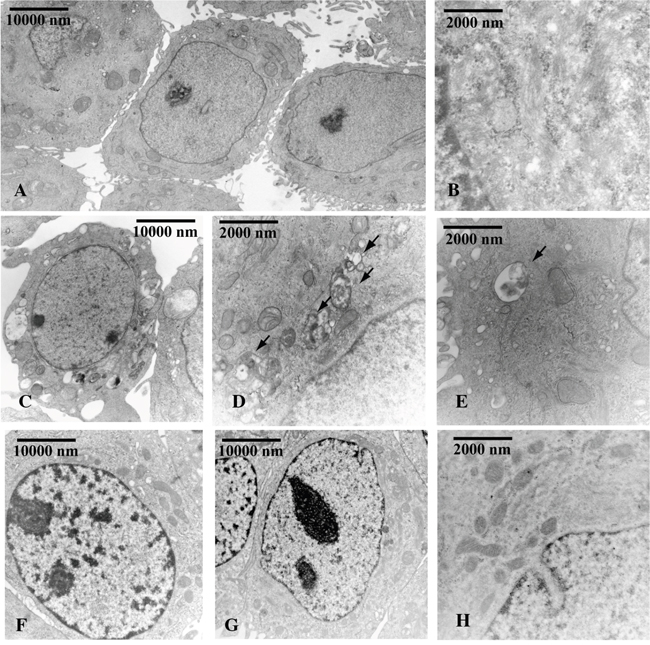 Figure 4: Beclin-1 is involved in OHPg induced autophagy in MCF-7 cells. TEM analysis was conducted in MCF-7 cells transfected with NS siRNA A-E. or with Beclin-1 siRNA F-H. treated with vehicle (-) A, B. or 10 nM OHPg C-H. for 24 h. Black arrows D, E. indicate the autophagic bodies. Figure shows the results of one representative out of three independent experiments. Images magnification: a 6300X, b 31500X, c 6300X, d 25000X, e 31500X, f 10000X, g 10000X, h 31500X.