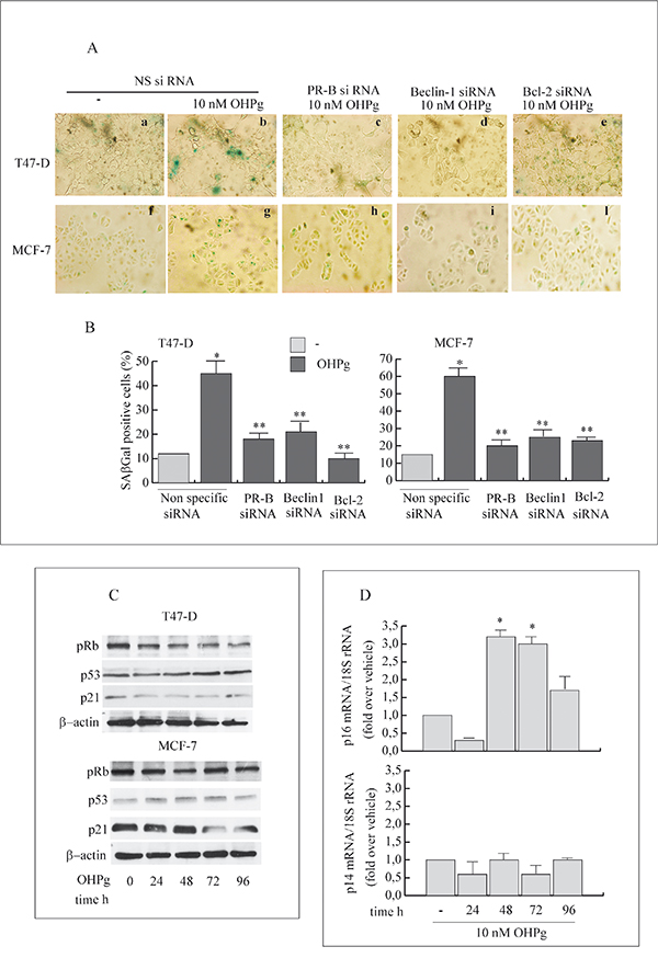 Figure 7: OHPg/PR-B induce cellular senescence and influence p16-pRb pathway in breast cancer cells. A. Representative staining for SAβGal activity of T47-D (a-e) and MCF-7 cells (f-l) transfected with non specific or targeted against PR-B, Beclin-1 or Bcl-2 siRNA treated with vehicle (-) or 10 nM OHPg for 96h. (magnification = 400×). Images are representative of three independent experiments. DAPI staining not shown B. Percentage of positive SAβGal cells was determined from quantitating three fields at 200× magnification. Values were normalized to total nuclei present in each field from DAPI staining *p ≤ 0.05 vs vehicle; ** p ≤0.05 vs NS siRNA 10 nM OHPg C. Western blot analysis of pRb, p53 and p21 expression in T47-D and MCF-7 cells treated with 10 nM OHPg as indicated. β actin was used as loading control. Autoradiographs show the results of one representative experiment out of three. D. Real-time PCR assay of p16 and p14 mRNA expression. T47-D cells were treated with vehicle (-) or 10 nM OHPg as indicated. 18S rRNA was determined as control. Columns are the mean of three independent experiments each in triplicate; bars, SD; * p ≤0.05 vs vehicle treated cells.
